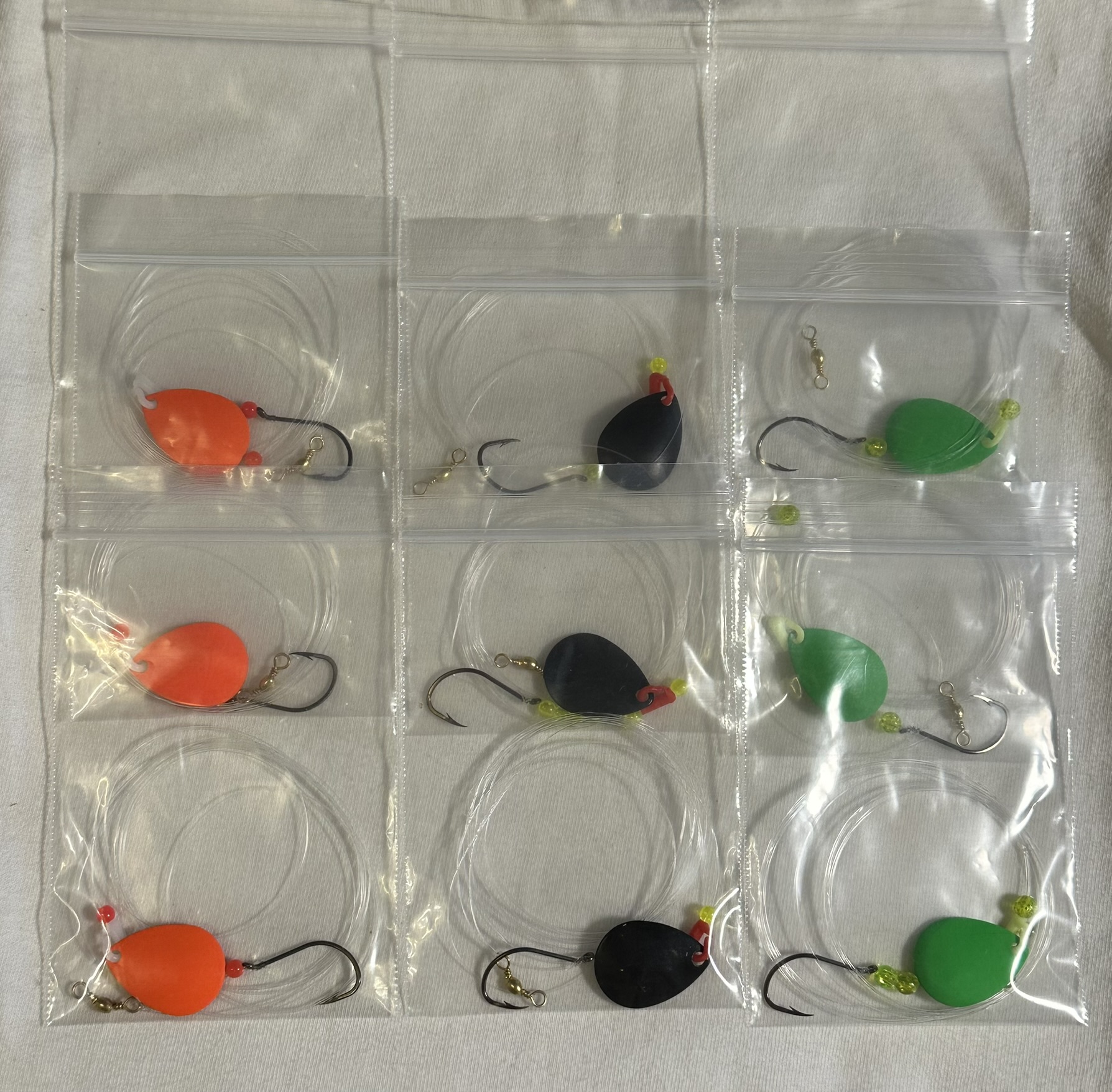 My rigs are hand made with 12# Monofilament Line, Mustad Hook #1, Colorado Spinner Blade #3, Leader Line is approximately 60 inches long with a Barrel Swivel, the Swivel helps prevent line twist. All Spinner Blades are attached to a Quick Change Clevis making it easy to change blade colors if needed.